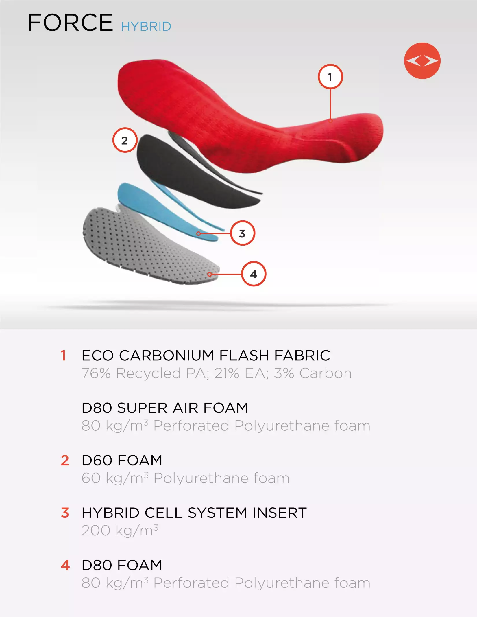 - Road Master insert con Hybrid Cell System (80kg/m3 + 200 kg/m3 + 60 kg/m3) nella zona perineale per quelli che necessitano della massima protezione e traspirabilità