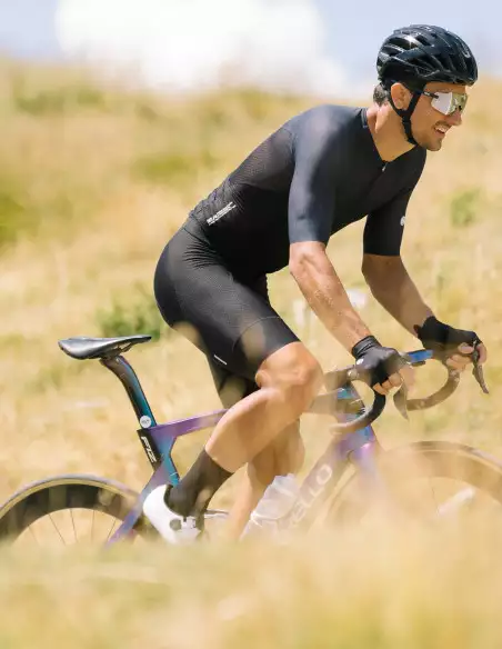 - Tessuto elastico, aerodinamico e a taglio vivo sulle maniche con finitura in silicone leggero antiscivolo